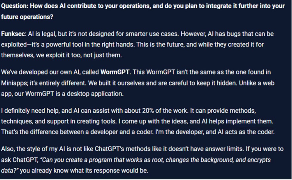 During an interview, an excerpt of which is shown below, the leader of Funksec emphasized their ability to act as developers and bring high-level ideas while AI acts as the programmer, enabling their ideas using their proprietary WormGPT module. This AI use case means less technical cybercriminals are becoming increasingly able to write malware without the scripting knowledge typically required.