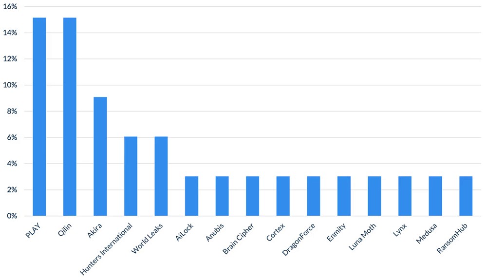 Although Akira was once again the most active ransomware group in January, the threat landscape was more evenly distributed than it was throughout most of 2025. In December 2025, the three most active threat groups accounted for 57% of all ransomware and extortion activity; in January, the top three accounted for just 34%. Akira’s dominance also decreased to levels more consistent with early 2025, as the group was responsible for almost a third of all attacks in December but just 17% in January.
