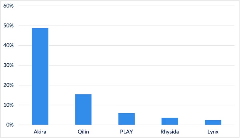 Akira had the highest share of ransomware attacks observed by Arete in a single month since the group emerged in April 2023. The group was responsible for almost half of the ransomware and extortion attacks in August. Qilin also remained active in August, albeit not to the degree that Akira was. Combined, these two ransomware groups were responsible for over 64% of the activity for the entire month.