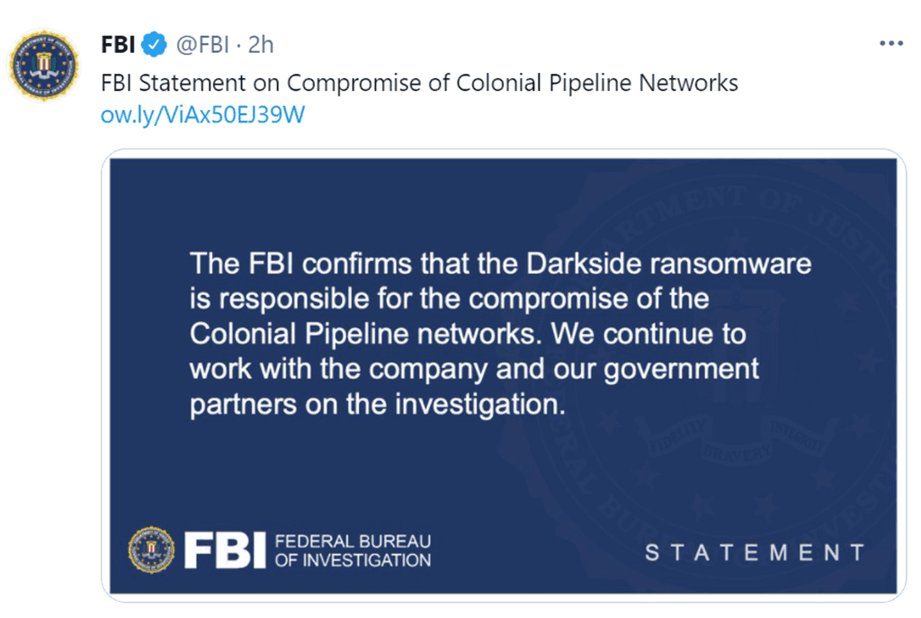 Today, the FBI announced in their Twitter page that the DarkSide ransomware is confirmed to be the malware affecting Colonial Pipeline: