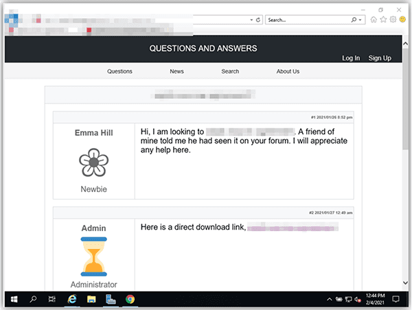 The malicious search results led to an actor-controlled site masquerading as a legitimate messaging board.