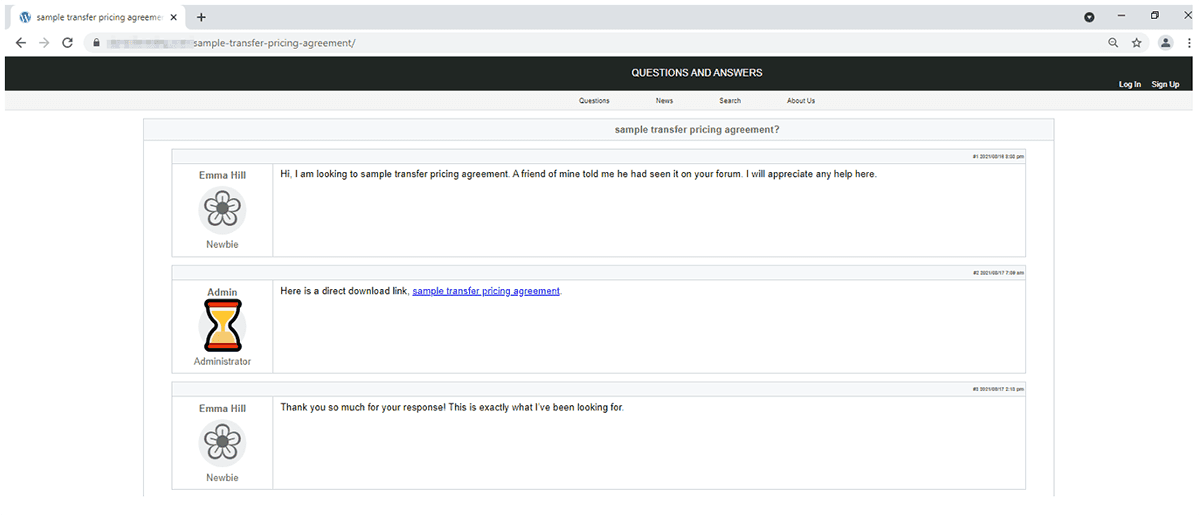 When compared side by side with the Gootloader watering hole REvil leveraged in Q1 2021, these pages are nearly identical (save for a different link, a different title of the document the user was searching for, and some slight modification to the icons of the fake forum users). Arete observed similarities between the watering hole leveraged by REvil and the watering hole leveraged by BlackMatter (Figure 1, Figure 3, and Figure 4). Similar behavior was previously reported for other Gootloader campaigns, including but not limited to matching “forum themes” and multi-language versions of the forums.