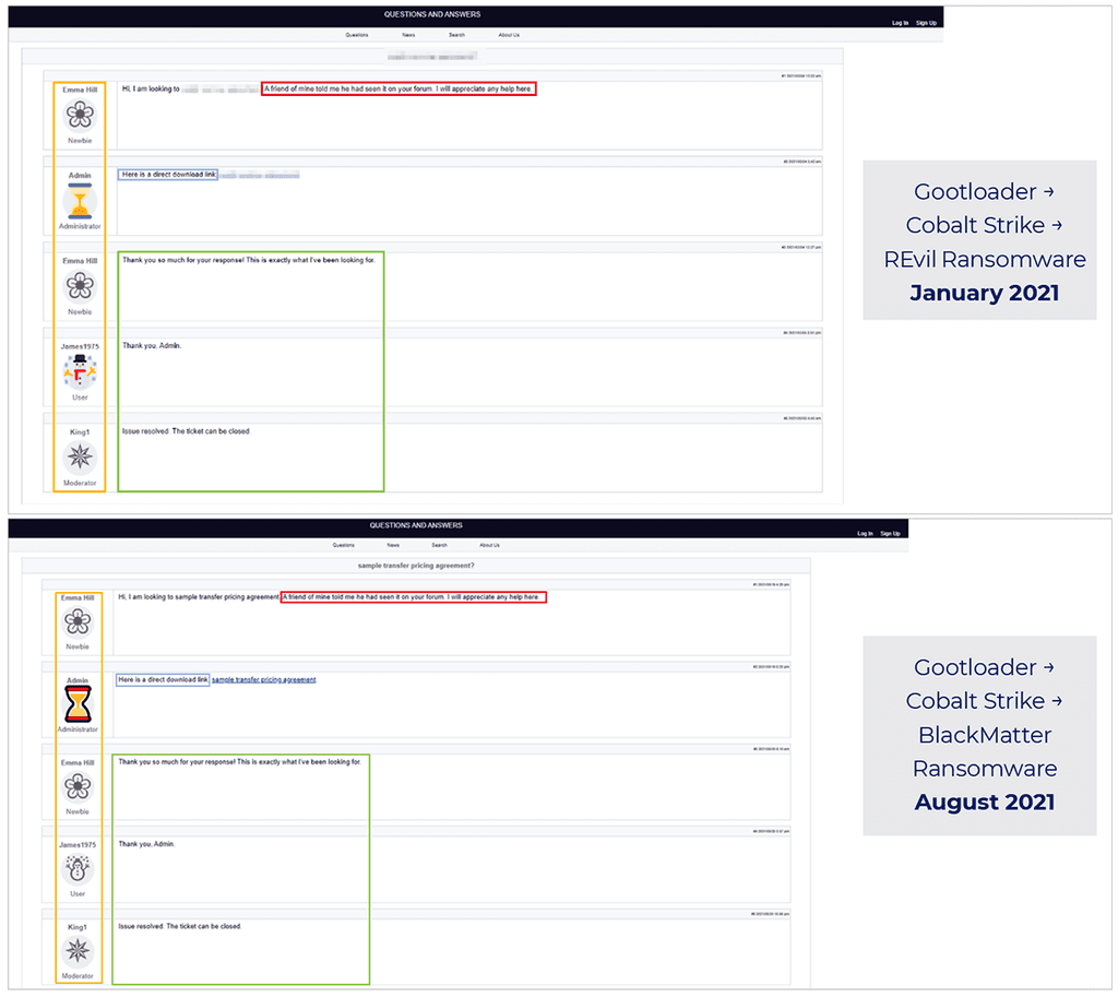 While it’s impossible to confirm with absolute certainty the linkage between REvil and BlackMatter, it is notable that both groups share a similar initial access tactic of leveraging fake forum posts weaponized with Gootloader, coupled with SEO hijacking, to gain an initial foothold in targeted environments.