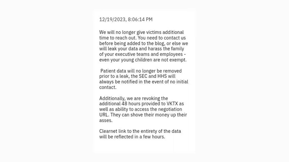 Shortly after the FBI announced the website seizure on December 19, 2023, ALPHV/BlackCat’s operators stood up a new data leak site and claimed their website was “unseized.” Security researchers assess that BlackCat operators maintained access to the keys used to sign the original data leak site but lost access to their original servers. After standing up the new data leak site, BlackCat made a new post about a victim and stated they will no longer give victims additional time to conduct negotiations. The operators also stated they will harass executive teams and their children, report companies to the SEC and US Department of Health and Human Services (HHS), and release a clearnet (regular internet) link to data on victims.