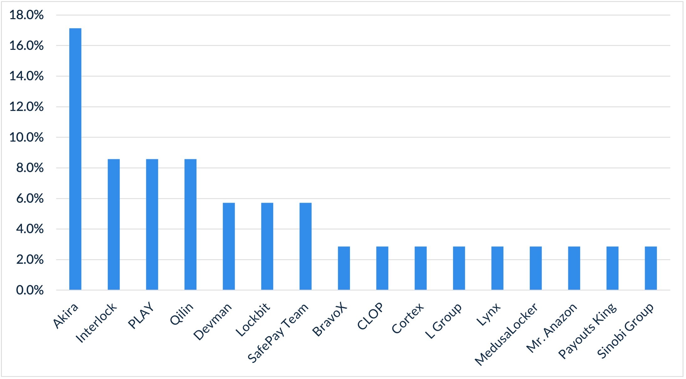 Although Akira was once again the most active ransomware group in January, the threat landscape was more evenly distributed than it was throughout most of 2025. In December 2025, the three most active threat groups accounted for 57% of all ransomware and extortion activity; in January, the top three accounted for just 34%. Akira’s dominance also decreased to levels more consistent with early 2025, as the group was responsible for almost a third of all attacks in December but just 17% in January.