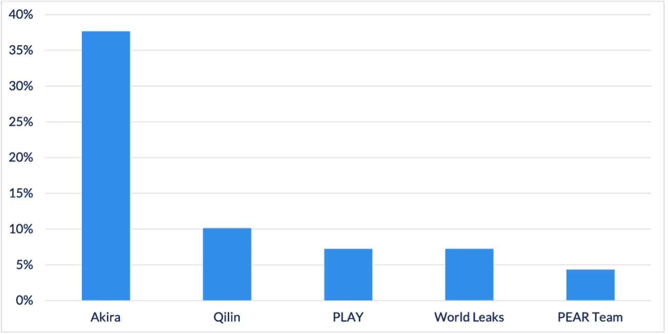In addition to the continued surge of Akira attacks, the number of unique ransomware variants increased compared to July and August, with 19 unique identified ransomware and extortion groups observed in September: